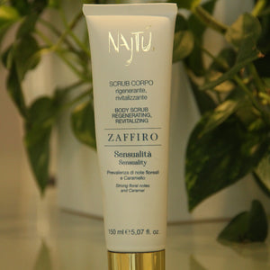 Scrub corpo Zaffiro è il trattamento ideale per rinnovare la pelle e risvegliare i sensi grazie ad una golosa profumazione al caramello salato, firmato Najtù.